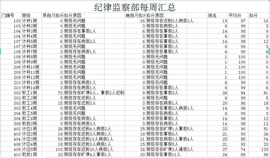 每天早自习对每个班的考勤人数及迟到人数,自习和读书情况,并如实记录,把每天查班情况回汇报给辅导员老师。坚持每天按时到岗,严查早餐进楼情况;见到老师礼貌问好;本周召开了纪律委员第四次周例会,对每位导员参与运动会值班的学生人数进行考核,还做好了运动会的后勤工作,维护反邪教标语,防止掉落。我们还会继续努力,营造良好的学习氛围,创造优良的学习风气。