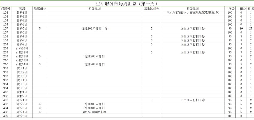生活服务部对整栋教学楼进行了严格检查和认真维护,早晚检查,按时上报检查情况同时负责与各班生活委员沟通指引,使得新学期的卫生工作走上正轨,在检查过程中继续标记难以打扫的地方,持续性的对难清理区域进行检查督察。