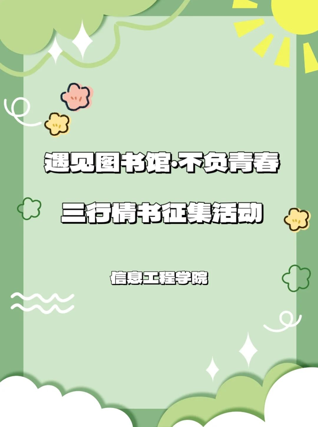在与图书馆共度的日子里,您一定有过欢乐、感动与收获。为了给师生提供一个用最唯美、最简单的真挚而朴实的语言表达对图书馆的情感,分享读书的快乐与体会的路径,举办"遇见图书馆 不负青春"三行情书征集活动。具体安排如下: