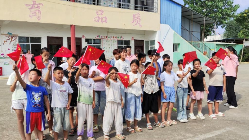 当天,14名志愿者带领着小朋友们整齐地站立在国旗台前。阳光洒在他们身上,国旗在微风中飘扬,仿佛在诉说着那段波澜壮阔的历史。小朋友们手中摇曳着小红旗,每一面旗帜都代表着他们对历史前辈的悼念与感激。
