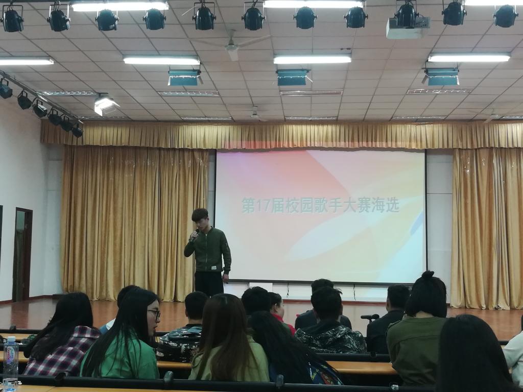比赛开始,由主持人解说比赛规则,之后各院系的选手纷纷上台展示,其中来自信息工程星空(中国)的石峰等几位选手倾情演唱的《春风十里》、《十年》、《成都》等经典歌曲,内容丰富,歌声婉转,感情充沛,并予以动作和姿态加以描述,将全场气氛推向高潮,深得观众及评委老师的赞赏,台下掌声不断,最终经过严格的筛选,激烈的竞争,石峰选手凭借出色的实力顺利晋级决赛。