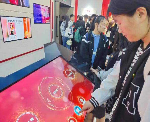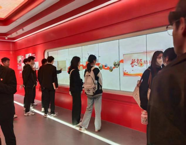 首先,豆耀鹏老师主要和大家讲解红馆的主要构成,由殷切期望馆、红色基因馆、理论素养馆、理想信念馆以及时代新人馆组成,利用3D环绕技术、信息瀑布流、沉浸式体验等现代信息技术,通过情景转换的模式,展现党的光辉历史,同时将教学内容进行有机串联。为党育人、为国育才,同学们和豆老师一同观看习近平主席系列讲话,号召大家开展党史学习大会,落实党中央要求,重视党史学习教育。红馆内大家沉浸式体验红军长征路,感悟党的艰辛历程;操作台上同学们上手操作,贴身走模范人物,感悟传奇经历。展示窗口中通过物件,音频,画面三者融为一体充分展现井岗山精神、延安精神、红船精神、西柏坡精神、长征精神的内涵 ,一幕幕场景令学生们感到震撼!