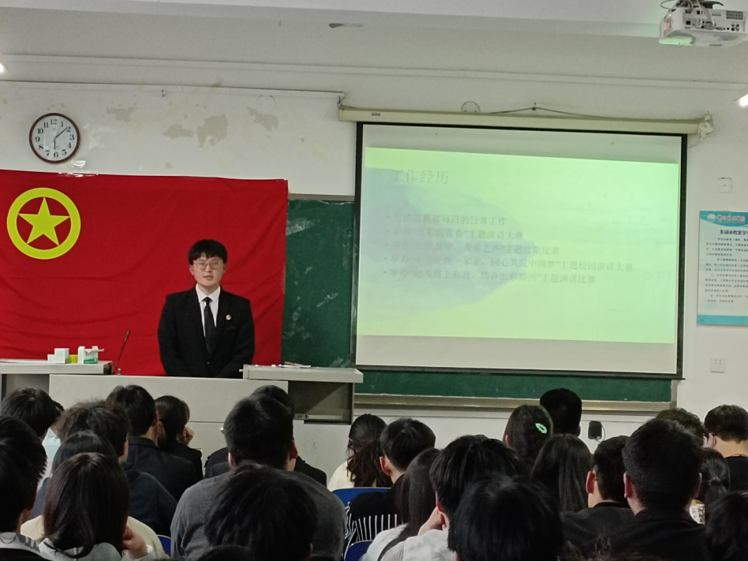 竞选开始前,21级学生干部组织竞选学生有序入场,所有竞选学生干部的同学逐一上台进行三分钟演讲,详细讲述了竞选的原因和对竞选部门的了解。在激情昂扬的竞选演讲中,每位同学以饱满的热情向大家表明竞选学生干部的愿望与努力工作的决心,希望可以锻炼自我,展示才能。他们纷纷表示要用行动去实现理想,用勤奋、踏实的工作态度完成每一项任务,全心全意为同学服务,充分发挥带头作用。