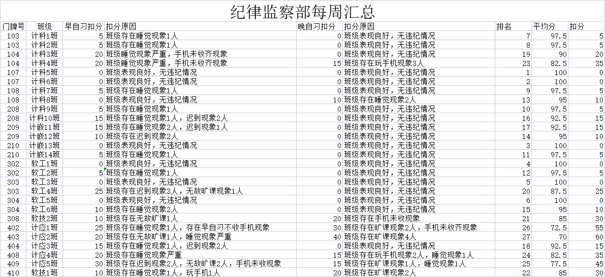 文明督察委员会纪律监察部每天早晚自习对每个班的考勤人数及迟到人数,自习和读书情况,并如实记录,把每天查班情况回汇报给辅导员老师。坚持每天按时到岗,严查早餐进楼情况;见到老师礼貌问好;本周还召开了纪律委员周例会,纪律委员分享本周问题和解决方案,学生干部进行补充并给出合理的解决办法。我们还会继续努力,促进优良学风建设,营造良好的学习氛围。