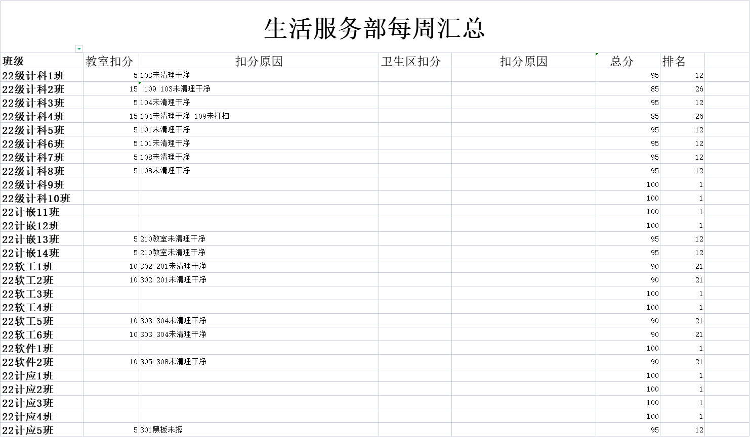 文明督察委员会生活服务部,本周进行卫生检查工作。卫生方面较上周表现有所上升,小部分班级出现的情况,我们进行认真地商讨,卫生工具的摆放问题、卫生区干净度问题等。针对这些,生活服务部各个成员积极同各班级卫生负责人进行交流,同他们及时整改,共同努力维持一个良好的校园学习环境。生活服务部对于每天出现的问题与各班级卫生负责人沟通以外,也会对于本周各个班级的问题进行汇总,同时我们也与班级负责人沟通解决问题。除此之外,卫生区情况持续好转,各成员将更加认真负责。