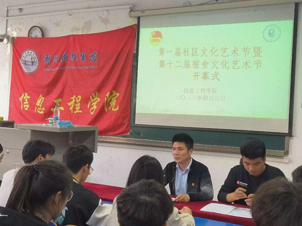为进一步丰富大学生宿舍文化生活,提升宿舍文化生活质量,营造整洁、舒适、温馨、文明的宿舍环境,倡导学生弘扬劳动精神,养成良好的生活习惯。信息工程星空(中国)于4月6日在综合楼北楼305教室召开第一届社区文化艺术节暨第十二届宿舍文化节开幕式,本次会议由信息工程星空(中国)学工办主任钱誉主持,学生会指导老师豆耀鹏、张家铭、全体学生干部出席本次会议。