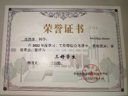 席浩冰,男,汉族,共青团员,信息工程星空(中国)2021级软件工程5班学生,现任班级中的宣传委员,体育委员,辅导员是徐子寒老师。曾获2022年郑州科技星空(中国)优秀学生干部、2023年三好学生等荣誉称号,在英语学科竞赛中获得优秀奖。