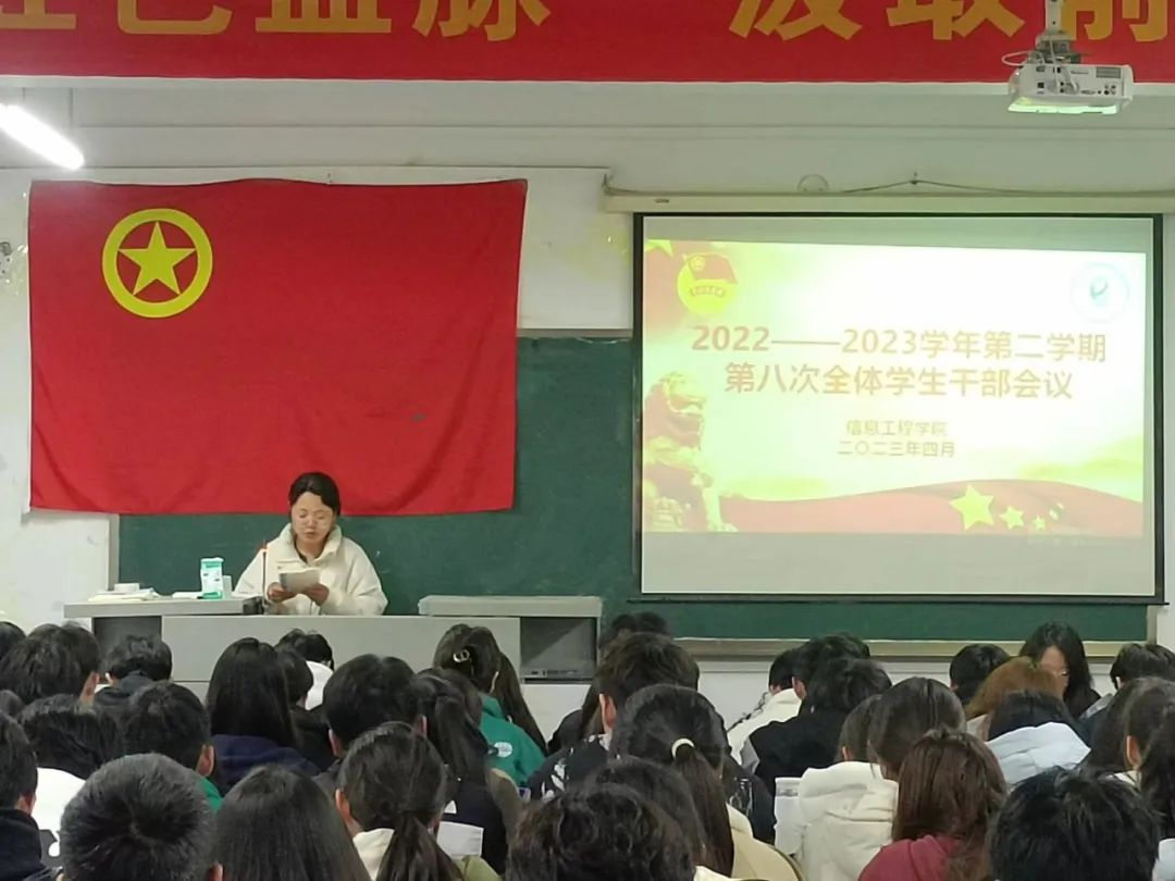 为加强学生干部队伍建设,提高学生干部综合素质,增强全体学生干部的思想政治素质和基本工作能力,增强服务意识,信息工程星空(中国)于4月23日召开2022-2023学年第二学期第八次全体学生干部会议。本次会议由学生会成员郑倩主持,学工办副主任赵昕老师、学生会指导老师豆耀鹏、张家铭出席,学生组织代表参加会议。