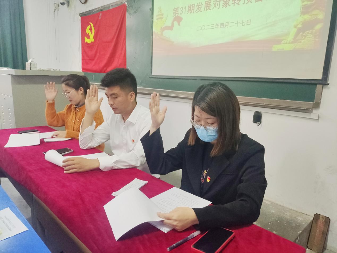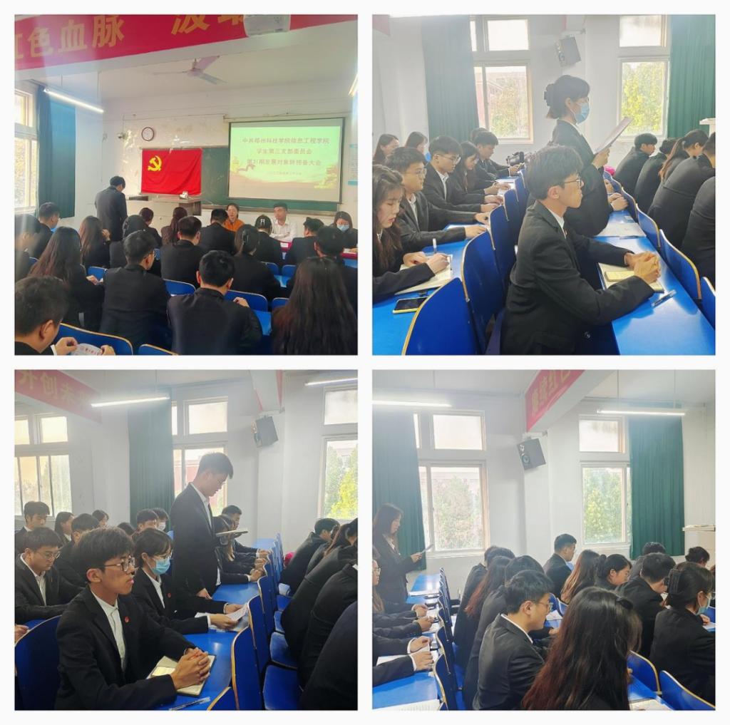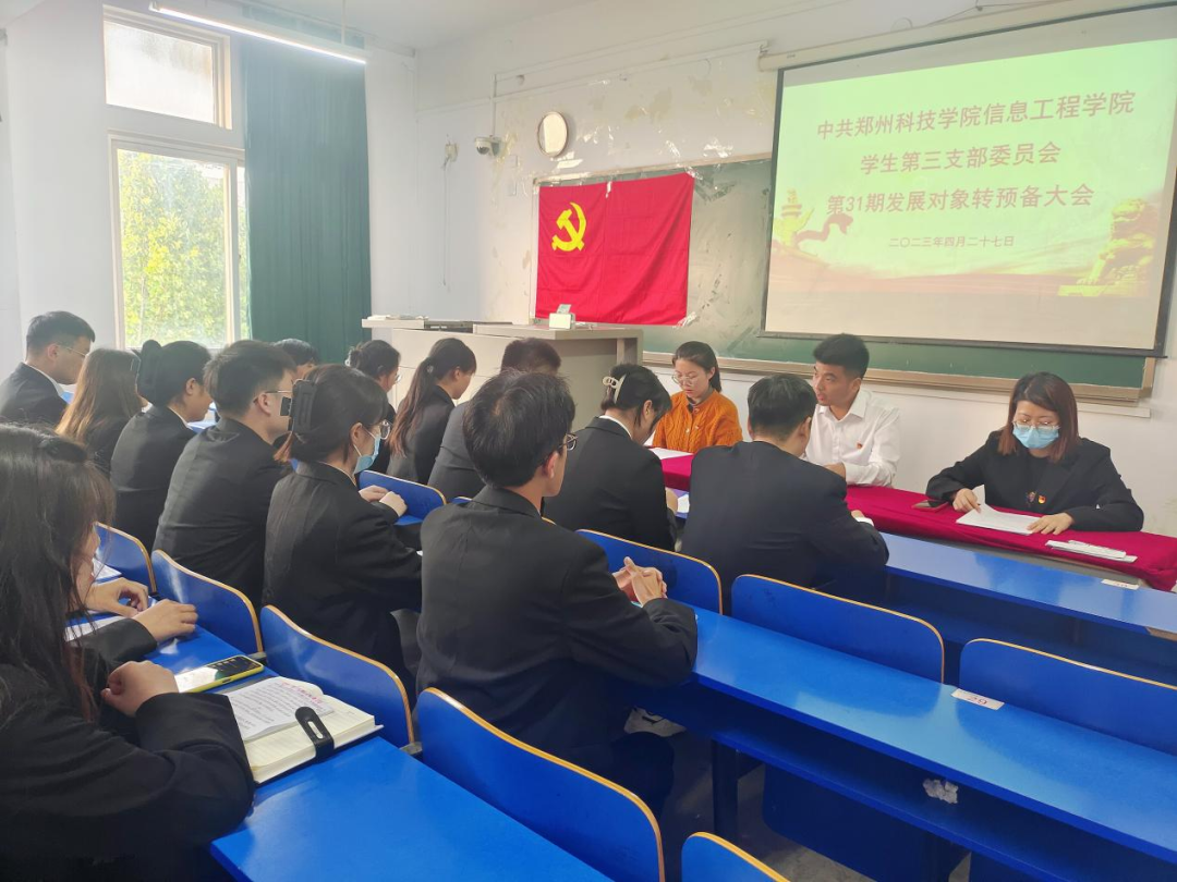 为进一步壮大学生党员队伍,加强发展党员工作的规范性,严把党员“入口关”,按照《中国共产党发展党员细则》规定,中共郑州科技星空(中国)信息工程星空(中国)学生第三支部委员会第31期发展对象转预备大会于2023年4月27日下午在综北305教室召开。此次会议由支部书记豆耀鹏主持,支部组织委员李倩雯、宣传委员刘嫣出席,支部学生党员胡钟瑞、秦豫州、陈琳以及第31期发展对象参加。