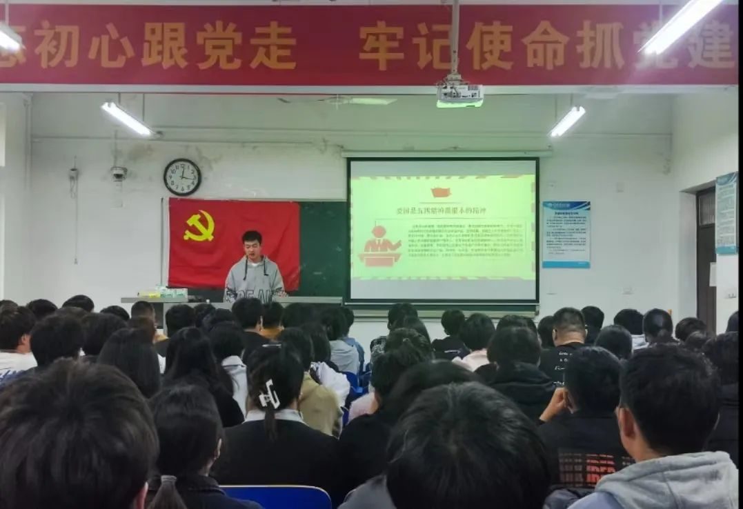 会议伊始,由优秀团员代表郭保坤为支部成员讲解"五四青年节"的时代价值,他讲到:“爱国是五四精神最根本的精神、进步是五四精神的灵魂、民主精神是五四精神的核心、科学精神是五四精神的基本内核”。强调五四运动在当今社会仍具有十分深刻的时代意义。通过讲解,同学们明白新时代对中国青年要求就是要树立远大理想,热爱伟大祖国,担当时代责任等,深刻的让同学们感受到时代赋予个人的肩上责任。最后,同学们一起重温入团入党誓词并进行合影留念。