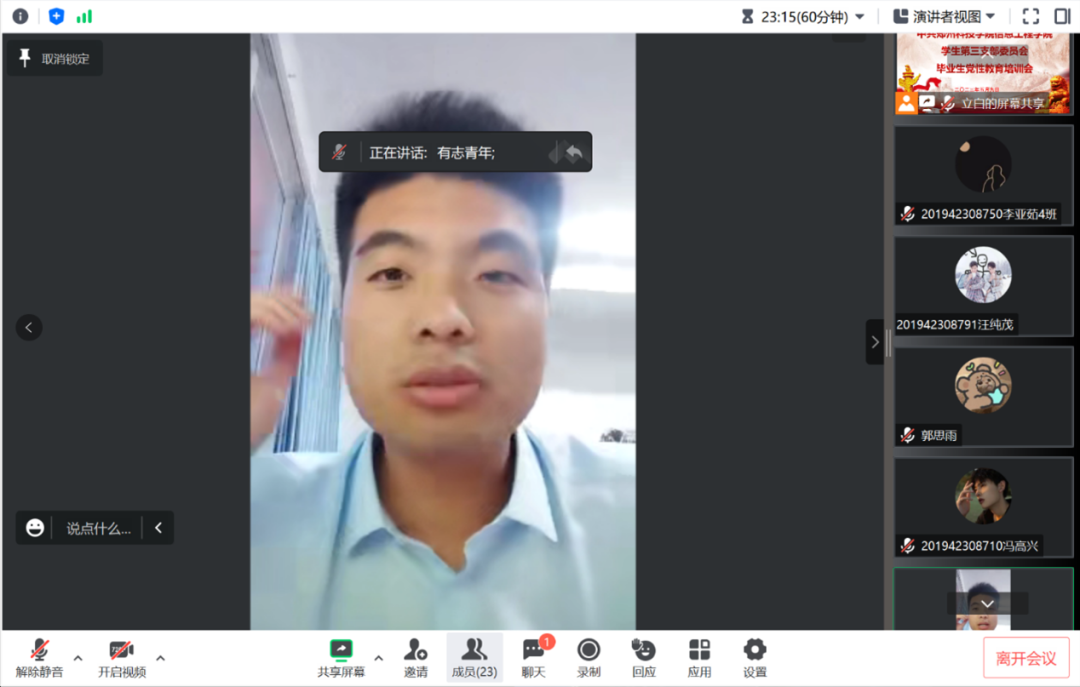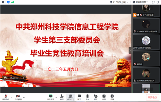 为进一步加强我院学生党员的党性,提升毕业生党员的党员意识和社会责任感,信息工程星空(中国)学生第三党支部于2023年5月9日晚,线上开展2023届全体毕业生党员专题教育大会。本次线上会议由学生第三党支部书记豆耀鹏主持,2023届全体毕业生党员参与。