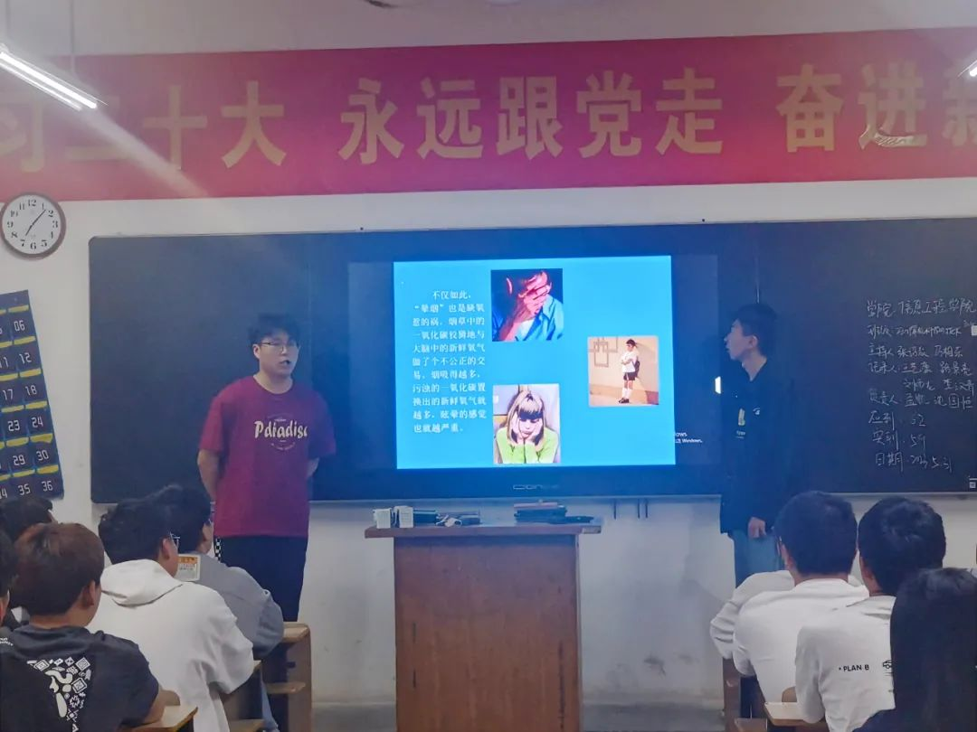 班会伊始,主持人为同学们介绍本次班会内容的主要部分,接着介绍吸烟带来的危害。烟草中尼古丁等物质会让人的心率加快,血压升高,影响大脑的化学反应,引起麻痹、头晕和焦虑等不适感,依照具体的数据讲述吸烟的危害,表明吸烟是全球最大的健康威胁之一。
