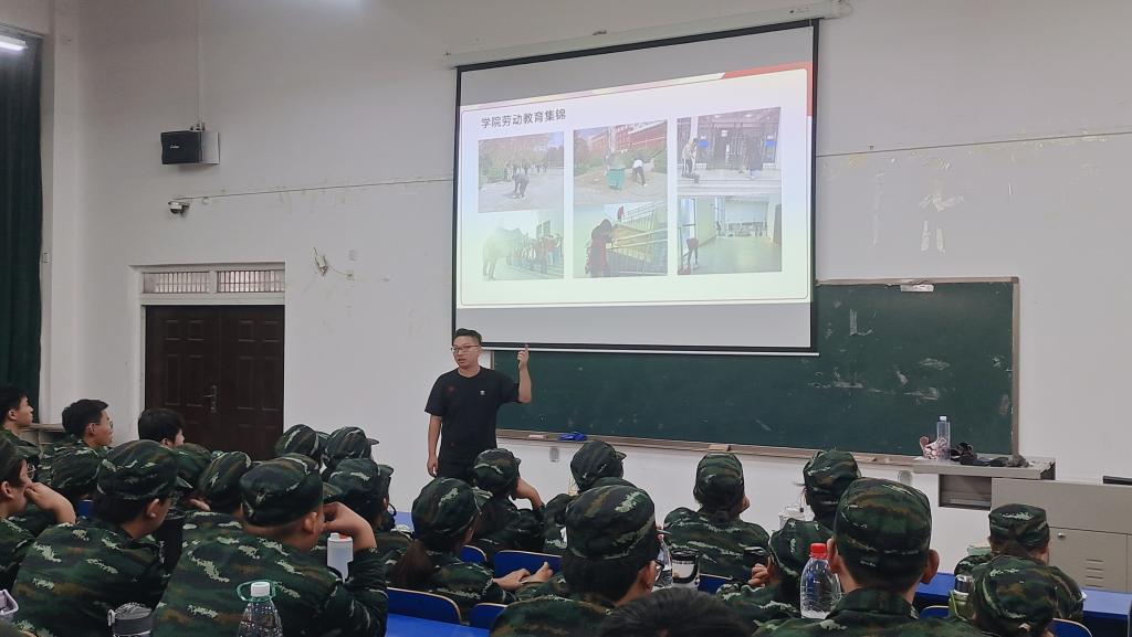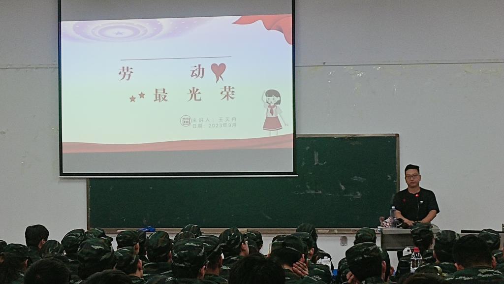 然后王天冉老师向同学们强调要尊重他人的劳动成果,无论是在军训中还是日常生活中,并通过分享实际案例和讨论,让同学们意识到每个人的辛勤劳动都应该得到尊重和认可。
