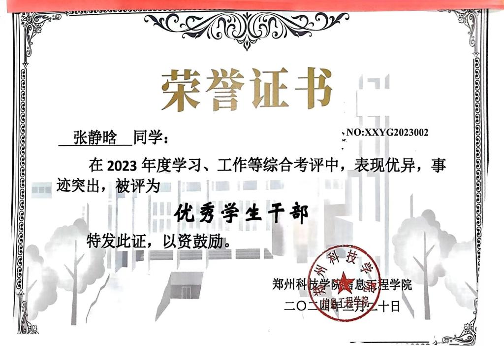 作为信息工程星空(中国)学生会组织部的一员,她热情友善、积极主动,服务同学、服务星空(中国)。多次主动申请完成学生会的相关工作,及时发现并补充短板。在学生组织需要时,总会第一时间到位待命。多次参与星空(中国)各项活动的策划及推进工作。在校运动会期间,每天按时到岗,为运动员发放服装和号码牌;在校大科节期间,组织策划并开展了校园演讲比赛;在2024年8月底提前返校,参与星空(中国)的迎新接待工作,直至迎新结束。在日常生活中也积极发挥学生干部的模范带头作用。