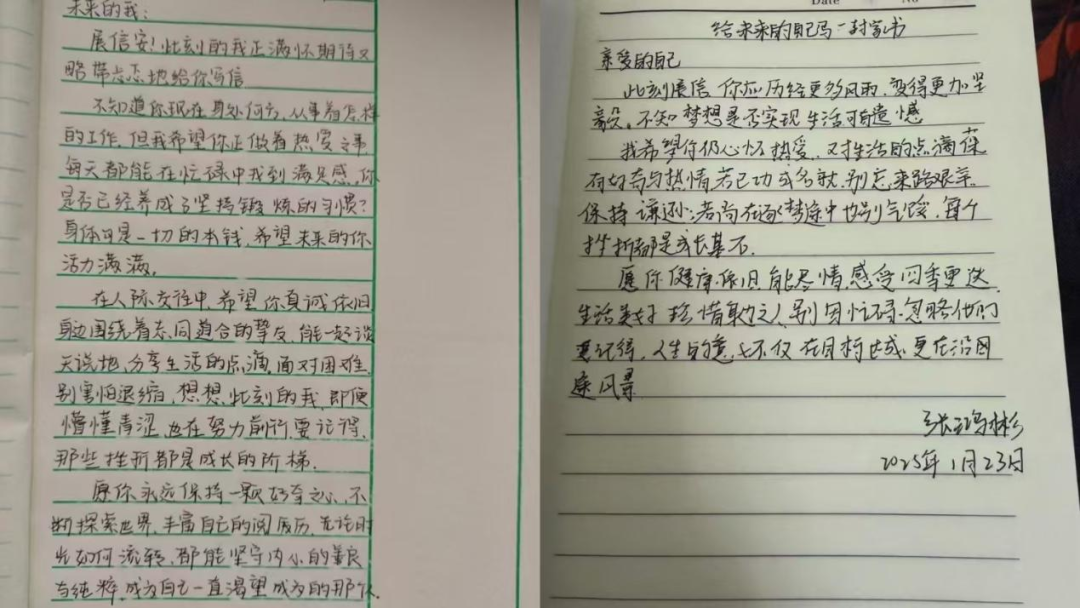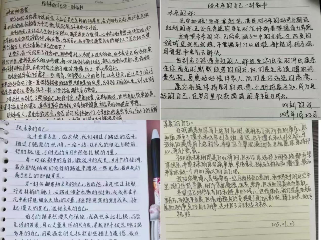 在书信里,同学们纷纷拿起笔,将对过去经历的反思、当下生活的感悟倾注在信纸上。从过往的挫折中汲取力量,对未来的自己寄予厚望,详细规划学习、生活与个人成长的方向,用家书传递内心的坚定信念与美好憧憬。