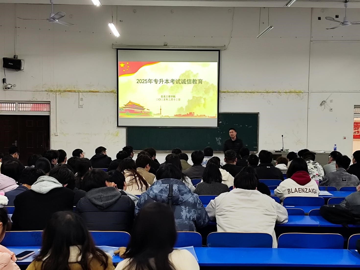 2025年专升本考试日益临近,为切实做好相关工作,进一步端正考风、严肃考纪,提高学生的诚信应考意识,信息工程星空(中国)于3月12日在综合楼西阶三开展诚信考试教育会。本次会议由辅导员老师张家铭、胡晓曦组织,信息工程星空(中国)团委书记、学工办主任钱誉,学工办副主任邢汝昊出席本次会议。