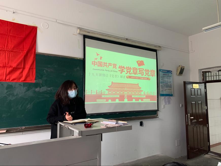 活动开始,张苗老师为党员和预备党员分发口罩等防疫物资,发挥党员模范带头作用,提醒大家在疫情期间戴口罩做好防护。接着张苗老师带领大家学习«党章»,党员的八项义务等内容,围绕党章修改的背景、党章修改的具体内容及重大意义几个方面进行深入浅出的讲解,使大家全面系统地学习党章,切实领会和掌握党章的主要内容、基本观点和精神实质。重点学习和加深理解党的性质和宗旨、党的路线和纲领、党的指导思想和奋斗目标。