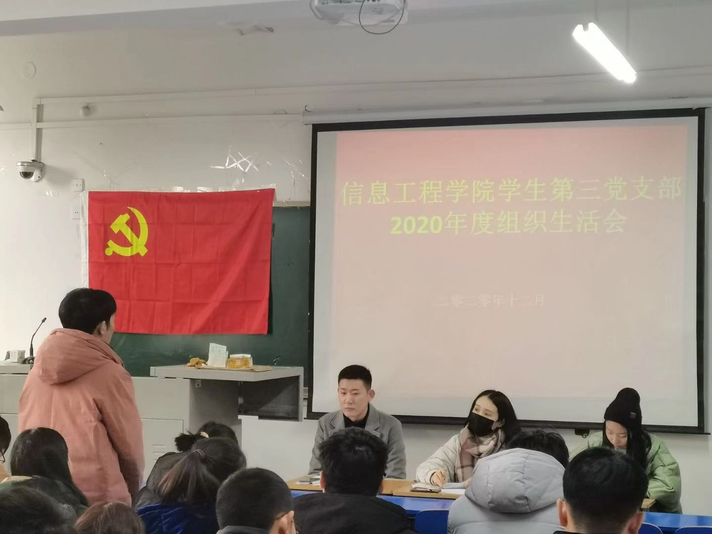 为深入学习贯彻党的十九大精神,进一步巩固“不忘初心、牢记使命”主题教育成果,加强党员干部思想作风建设,提升党建工作质量和水平。信息工程星空(中国)学生第三党支部于2020年12月29日在综北205召开学生第三党支部2020年度组织生活会。本次会议实到党员和预备党员共计25人,由支部书记乔圣宸主持。