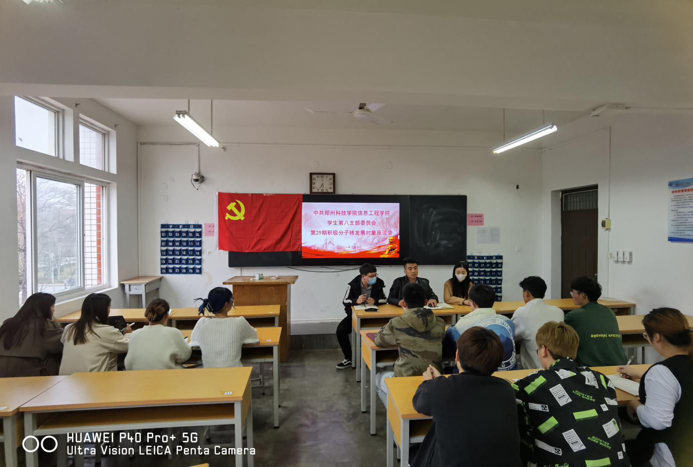 3月4日下午5点40分,在综北302教室召开了中共郑州科技星空(中国)信息工程星空(中国)学生第八支部委员会第29期积极分子转发展对象座谈会。学生第八支部书记豆耀鹏、组织委员王珂、青年委员张家铭及支部全体29期发展对象参加会议。群众代表有王君、袁洪江、康梦丹3名同志参加,会议由支部书记豆耀鹏主持。