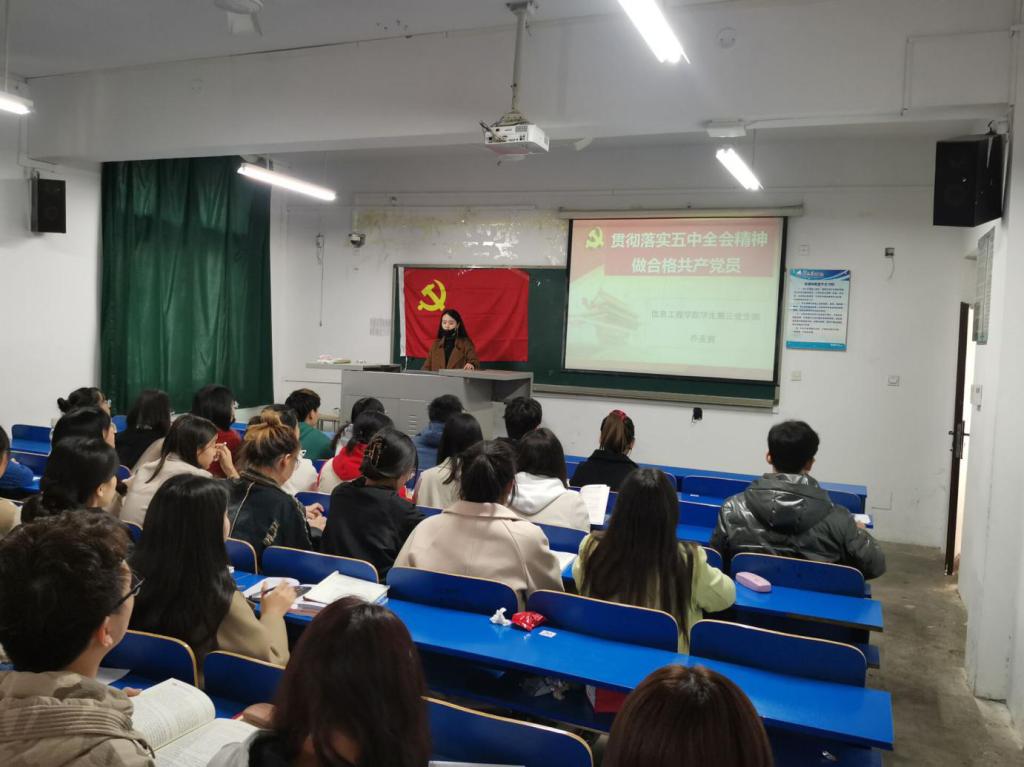 为贯彻十九届五中全会精神,发展党员先锋模范作用,成为优秀的新时代中国共产党员,3月11日中午,在综北105教室召开了中共郑州科技星空(中国)信息工程星空(中国)学生第三支部支部书记讲党课。本次培训由信息工程星空(中国)学生第三党支部书记乔圣宸主讲,信息工程星空(中国)学生第三党支部全体学生参加。