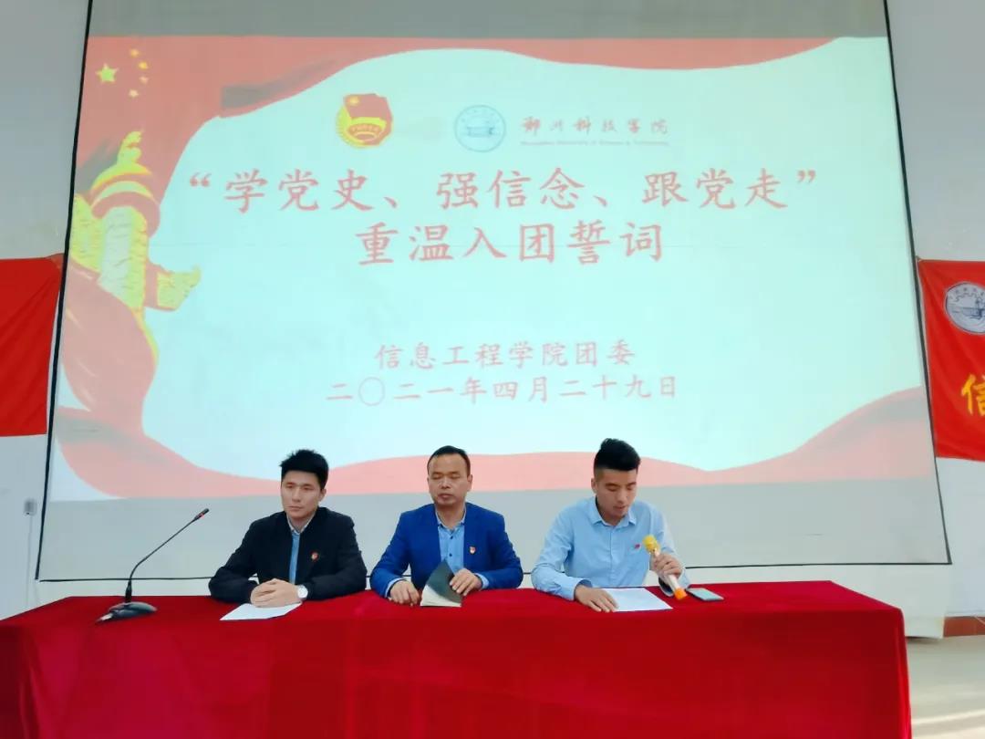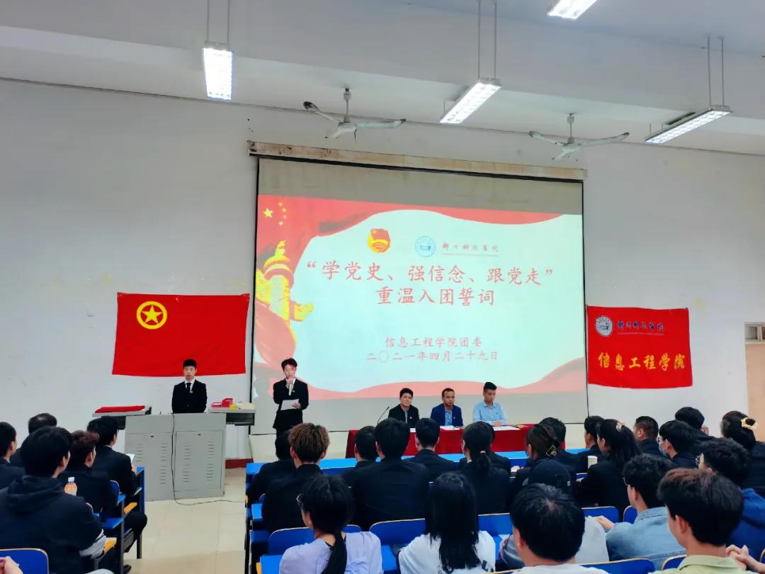 为迎建党一百周年,响应党的号召,深入学习贯彻习近平总书记的讲话精神,推动党史学习教育在全校持续深化,引导广大团员青年厚植爱党爱国爱社会主义的情感。4月29日,信息工程星空(中国)团委在多功能报告厅举行“学党史、强信念、跟党走”系列主题团日活动之仪式教育——重温入团誓词活动。本次活动由学生会负责老师豆耀鹏主持,党委委员赵国喜老师、团委书记钱誉老师出席本次活动,信息工程星空(中国)各团支部团员代表参加本次活动。