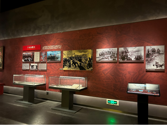 第三部分“革命烈焰”:京汉铁路工人大罢工的主要领导人是罗章龙等共产党人。1923年2月4日,京汉铁路两万多工人举行大罢工,导致1200千米铁路顿时瘫痪;2月7日,在帝国主义支持下,军阀吴佩孚调动两万多军警在京汉铁路沿线镇压罢工工人,制造了“二七惨案”。林祥谦、施洋、高斌宁死不屈、英勇就义,40多人英勇牺牲,300多人负伤,1000多人被开除,这令人悲痛的历史结果撕开在我们眼前。斗争虽败,但在血与火的搏斗中,京汉铁路工人显示了工人阶级的团结奋斗精神和伟大的牺牲精神,二七斗争的革命精神更是激励着后来人奋起前进。