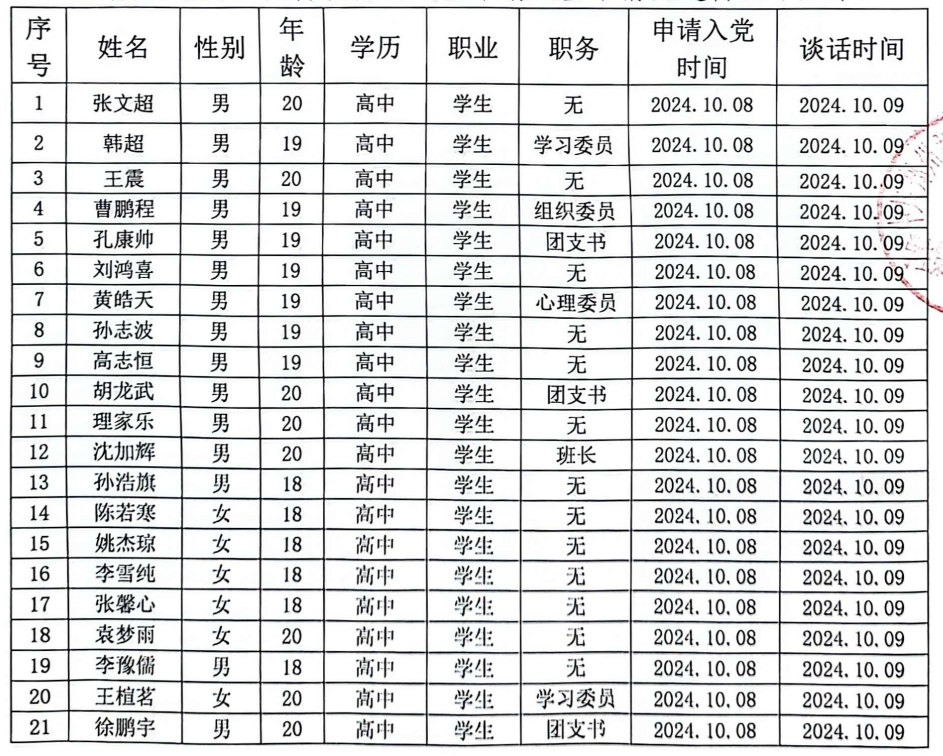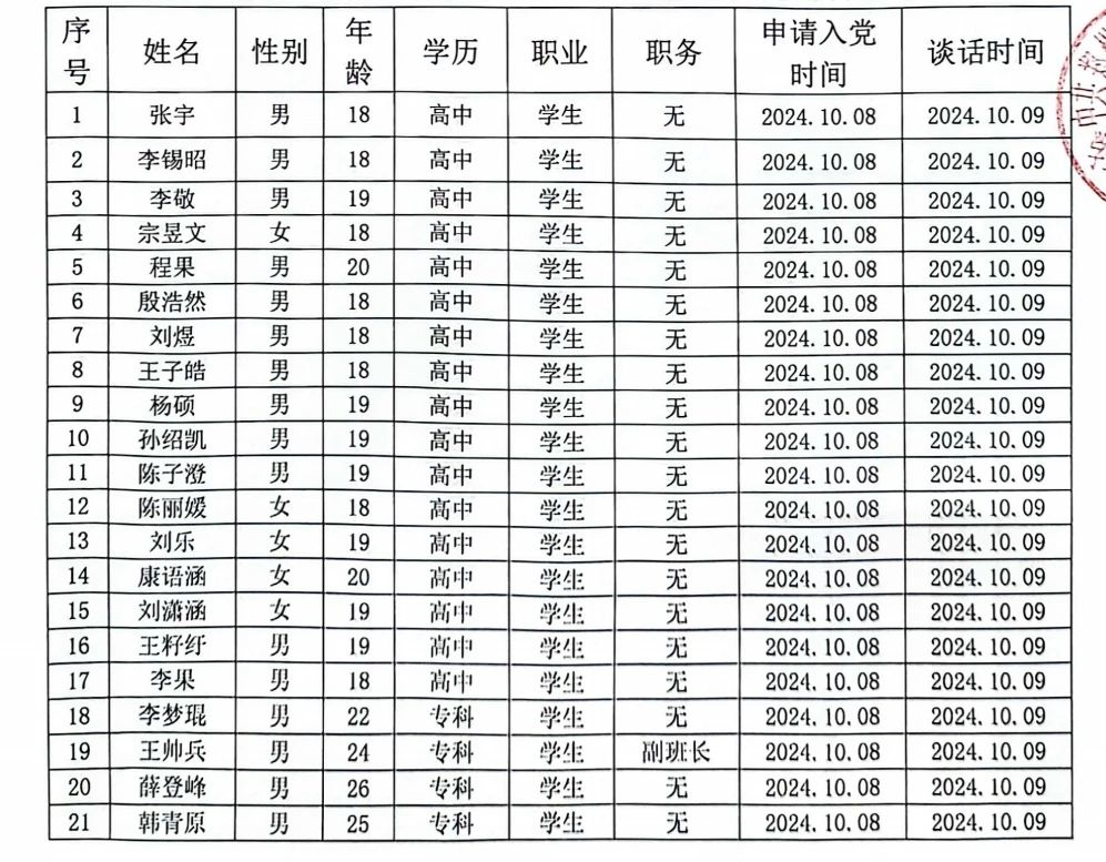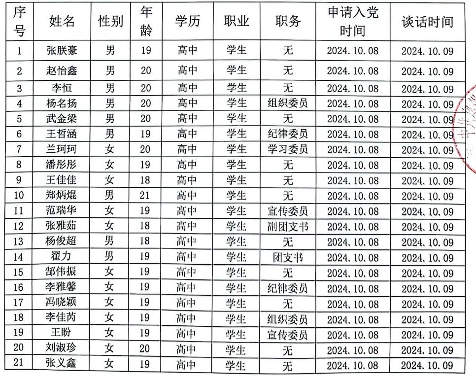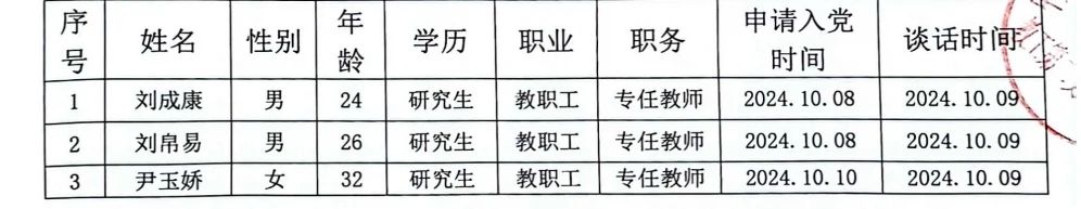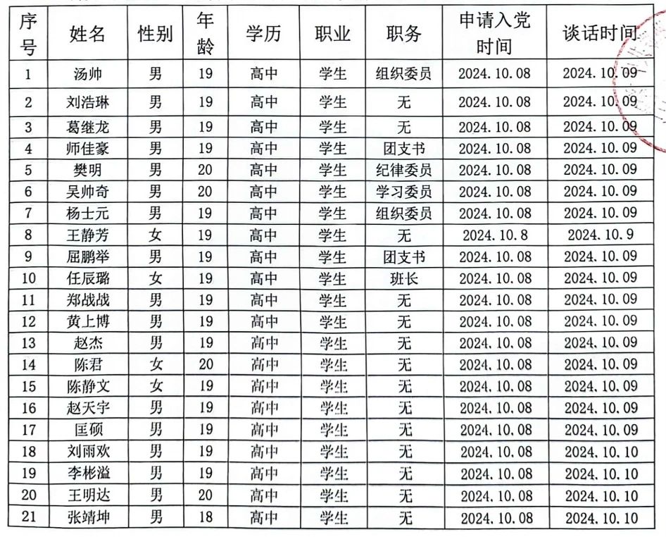 根据《中国共产党章程》规定及《中共河南省委组织部印发<星空网页版登录入口实行“双推双评三全程”进一步规范发展党员工作的意见>等3个加强党员队伍建设工作文件的通知》(豫组通〔2017]47号)和校党委党员发展工作要求,经本人申请,党支部派人谈话,本支部将对确定入党申请人进行培养教育和考察。