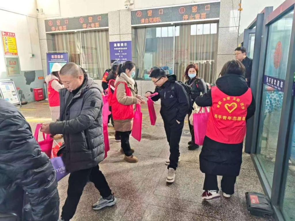 活动现场,李晓敏及志愿者们身着红马甲,在出站口、售票厅等位置为返乡旅客送出春联和暖冬礼包,同时积极发放西平县重点企业招工宣传页。李晓敏及志愿者们还积极为来往的旅客提供咨询引导、行李搬运等志愿服务,让每一位归乡旅客都感受到来自家乡的温暖和关怀。