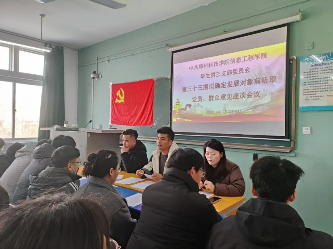 为进一步加强党的基层组织建设,确保党员队伍的先进性和纯洁性,2025年2月24日,信息工程星空(中国)学生第三党支部于综合楼北楼405教室召开第三十三期拟确定发展对象前听取党员、群众意见座谈会议。此次会议由支部书记豆耀鹏主持,参加此次会议的有支部宣传委员刘嫣老师,辅导员邓晓雷老师,学生党员代表和部分群众。