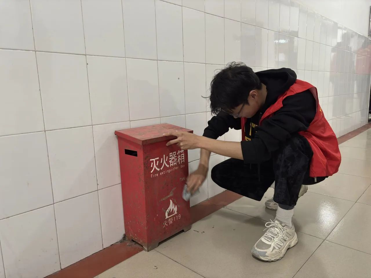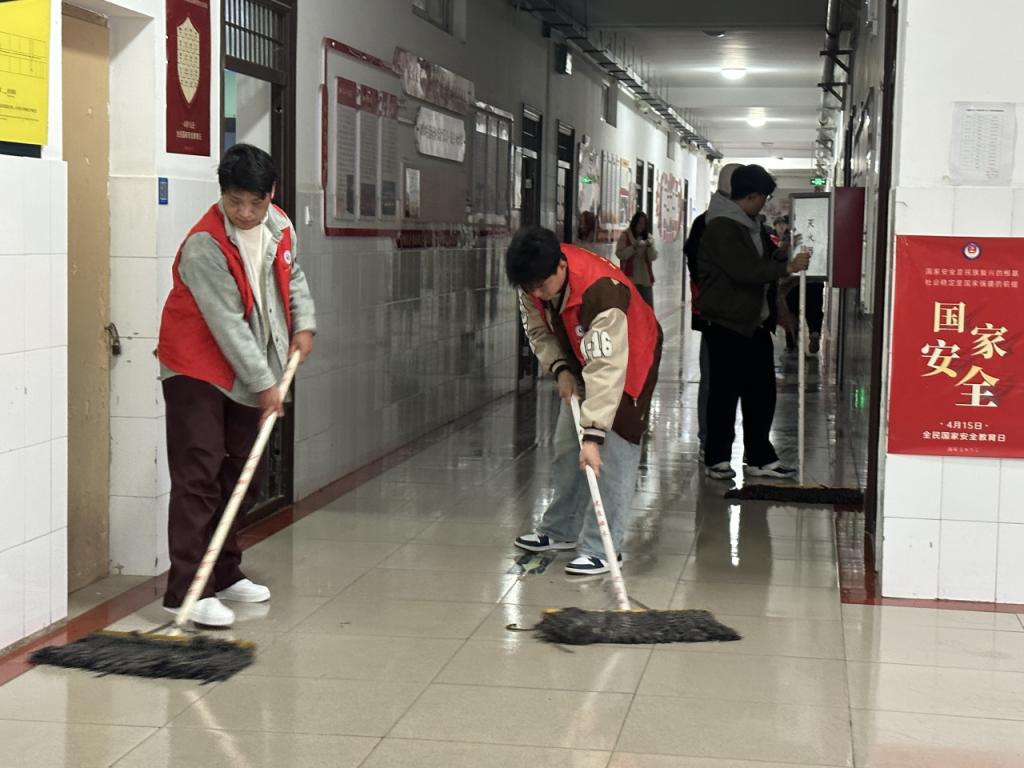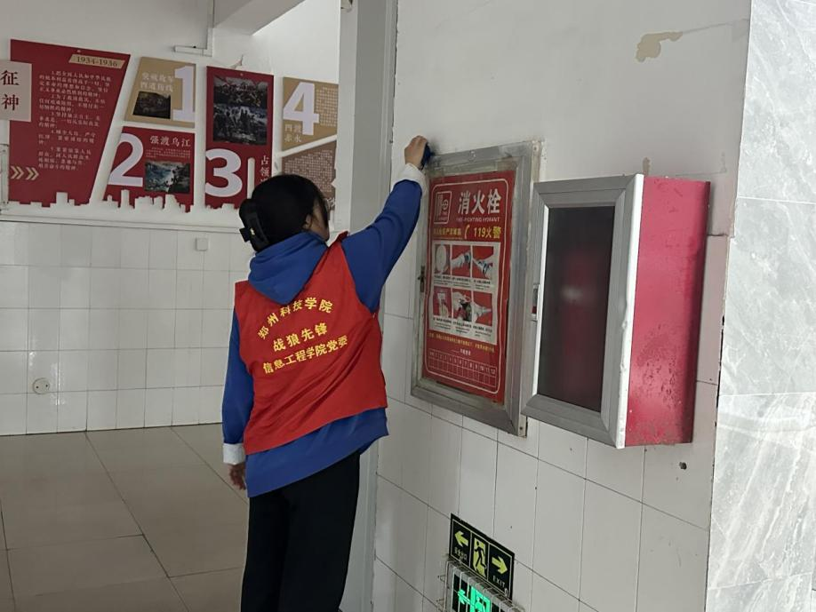 为深入贯彻落实校园精神文明建设要求,切实提升师生消防安全意识和校园环境治理水平,信息工程星空(中国)学生第四党支部联合校保卫处于2025年3月11日组织开展"擦亮文明窗,净楼树新风"专项清洁行动。此次活动覆盖综合教学北楼1至5层公共区域,重点对楼层消防设施进行全面清洁维护。