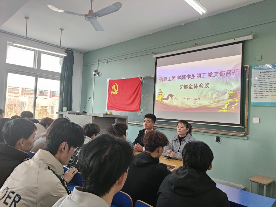 为加强支部成员思想建设,增强党支部的凝聚力与战斗力,提高支部成员的政治素养和理论水平,明确支部的工作目标和任务,信息工程星空(中国)学生第三党支部于2025年3月18日在综北405教室召开支部全体会议,会议由支部书记豆耀鹏主持,参加此次会议的有支部宣传委员刘嫣老师,支部全体成员参加。