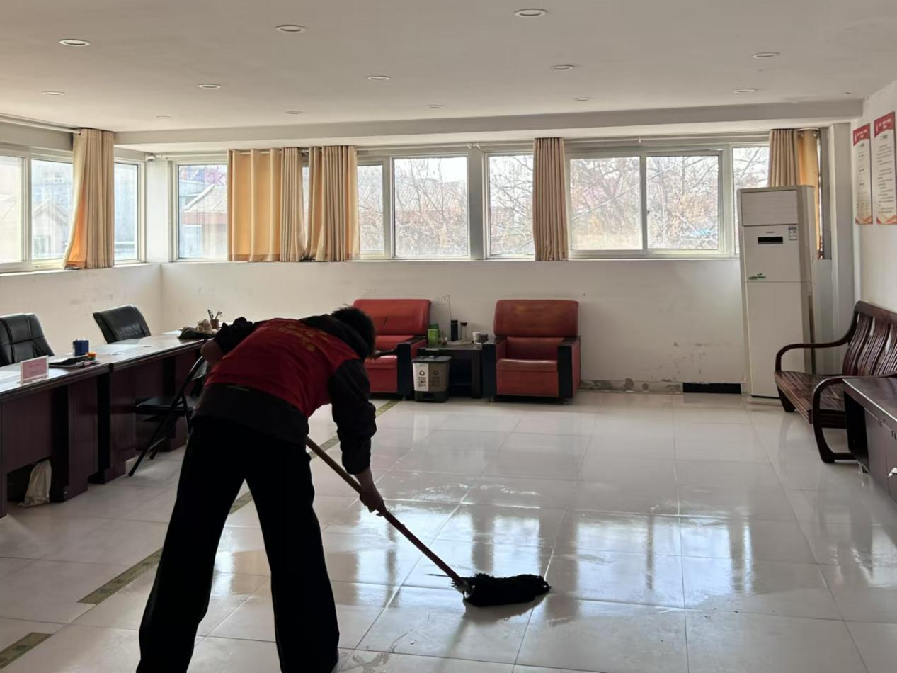 负责扫地的同学手持扫帚,仔细地清扫着大厅、走廊以及各个功能室的地面,不放过任何一个角落,将灰尘和杂物统统扫进簸箕;擦桌子的同学则用湿布认真擦拭着服务台、会议桌、宣传栏等,使原本有些灰尘的桌面焕然一新;清理蜘蛛网的同学充分发挥不怕脏、不怕累的精神,借助梯子等工具,将天花板和墙角处的蜘蛛网一一清除;拖地的同学更是干劲十足,他们先用湿拖把拖了一遍地面,随后又用干拖把进行擦拭,让地面变得干净整洁、光亮如新。