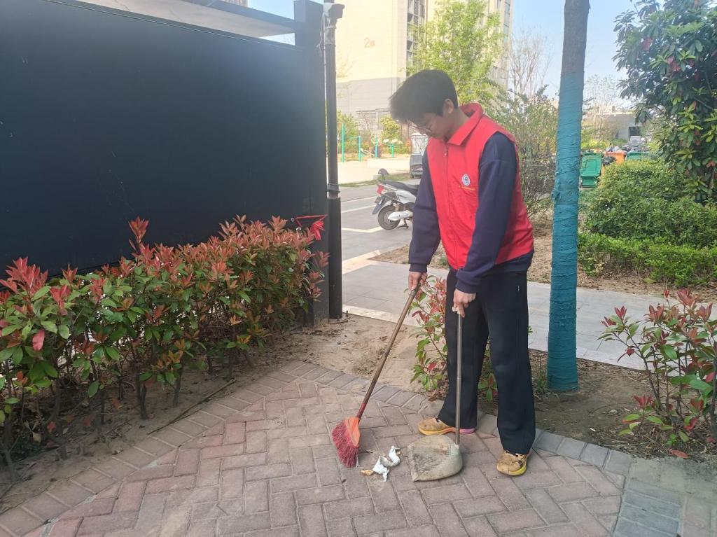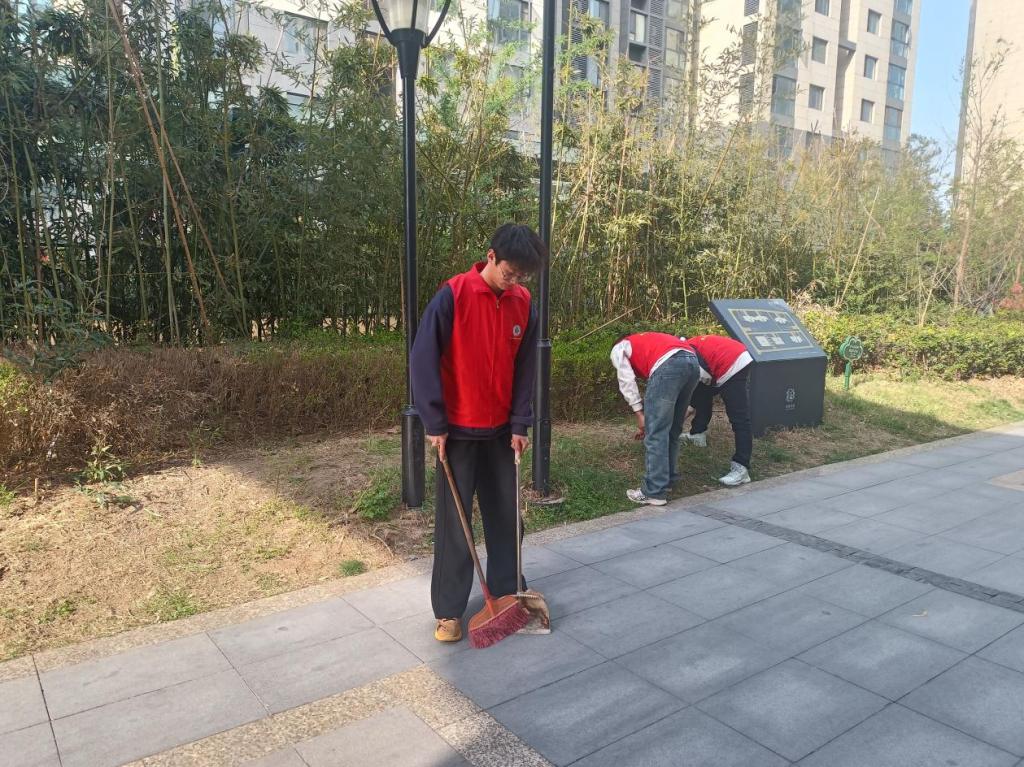 一到社区,同学们便迅速有序地行动起来。负责清扫道路的小组,同学们手持扫帚和簸箕,默契配合。他们认真清扫每一处角落,不放过一片落叶、一丝纸屑,不一会儿,道路便恢复了干净整洁。