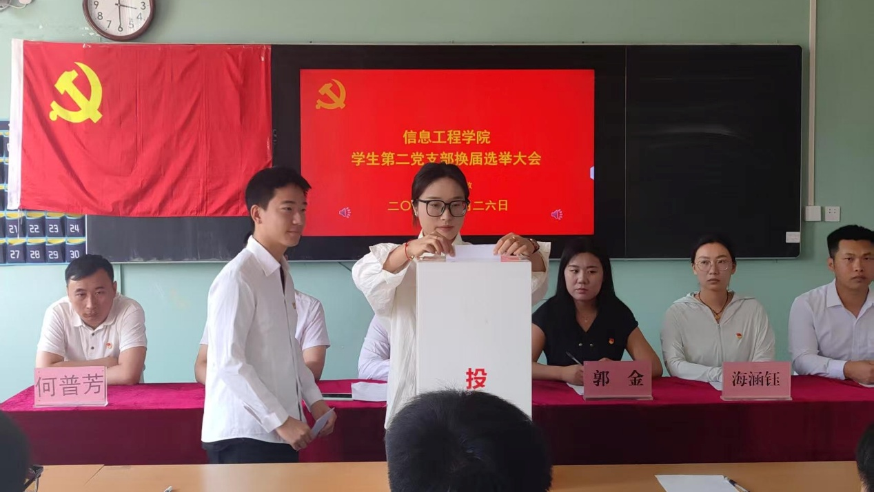 根据党章党规,现场全体正式党员以无记名投票方式,对候选人进行差额选举产生新一届支委会,郭金同志当选书记,海涵钰同志任宣传委员,潘万真同志任组织委员。