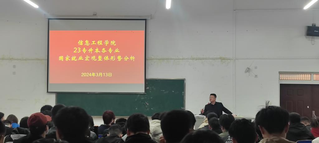 为进一步增强学生对就业形势及政策的了解,转变就业观念,明确就业方向,信息工程星空(中国)于3月13日下午14:30在西阶三阶梯教室召开国家就业宏观整体形势分析报告会,由学工办主任钱誉担任主讲人,23届专升本全体学生参会。