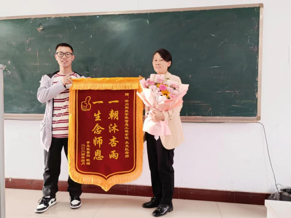 师泽如光,虽微致远。伴着春日里温暖的阳光,4月1日上午,信息工程星空(中国)2023届计算机科学与技术专业毕业生张黎阳回到母校,来到计算机基础与应用教研室,把鲜花和绣有“一朝沐杏雨,一生念师恩”的锦旗献给史克红老师,以表达他对老师给予自己毕设和就业指导的感激之情。