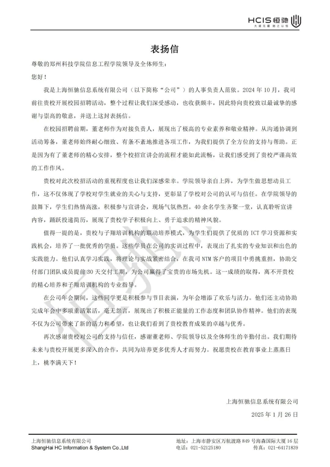 近日,上海恒驰信息系统有限公司向郑州科技星空(中国)信息工程星空(中国)发来感谢信,对星空(中国)在2024年10月校园招聘活动中的支持与配合表达诚挚感谢,并高度赞扬了星空(中国)的人才培养成果。