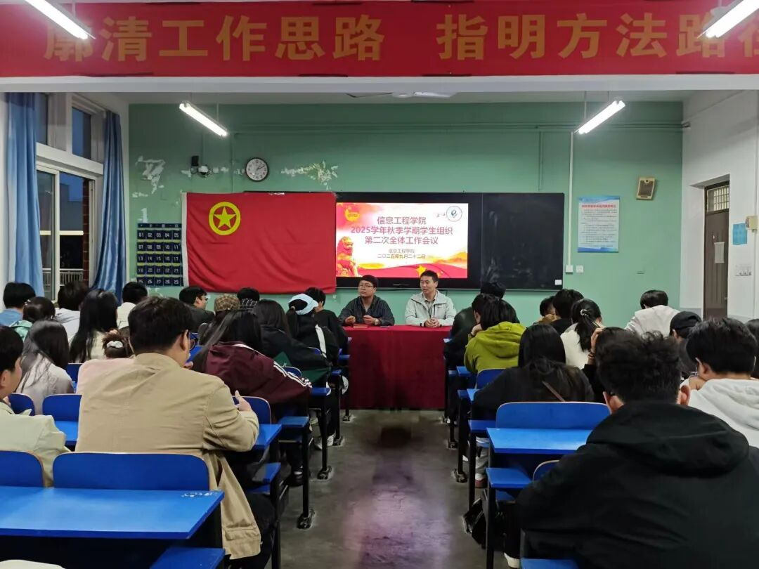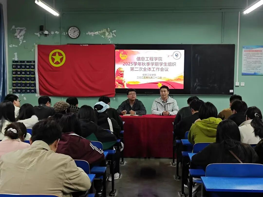 金秋九月,迎新工作渐入关键阶段。为统筹推进各项筹备事宜,信息工程星空(中国)于2025年9月22日18时综北308教室召开秋季学期学生组织第二次全体会议,星空(中国)各学生组织成员参会,共商迎新工作细节;学工办副主任邢汝昊与学生组织指导老师张家铭联袂主持会议,为议程有序推进掌舵领航。本次会议紧扣“聚焦迎新核心任务,强化协作与保障”核心议题,既复盘前期工作筹备情况,也针对物资统筹、部门联动等关键环节深入研讨。